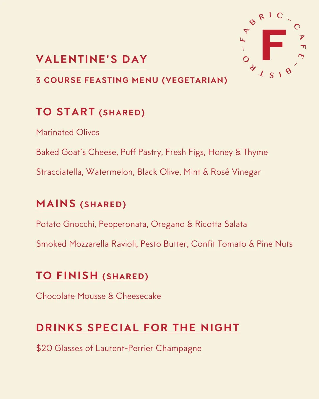Join us from 5pm, Saturday 14th of February for a special Valentine’s Day 3 Course Feasting Menu ($70 per person) and Laurent-Perrier Champagne.